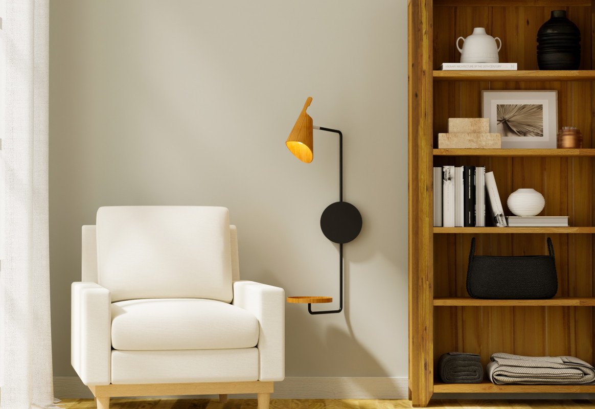 Arandela feita com lâmina natural de madeira e aço carbono.