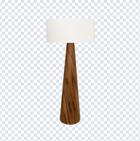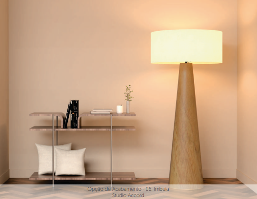 Luminária de piso feita com lâmina natural de madeira e cúpula em tecido algodão cru.