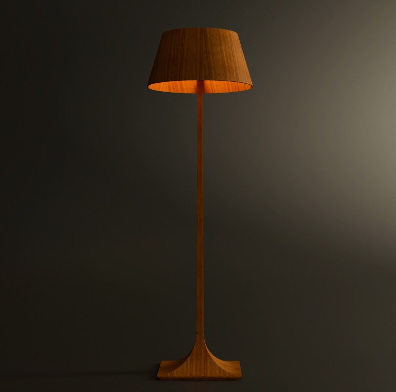 Luminária de piso feita com lâmina natural de madeira.