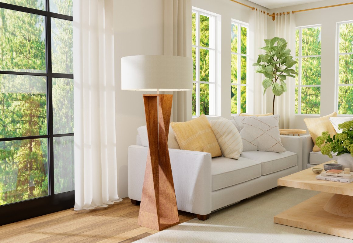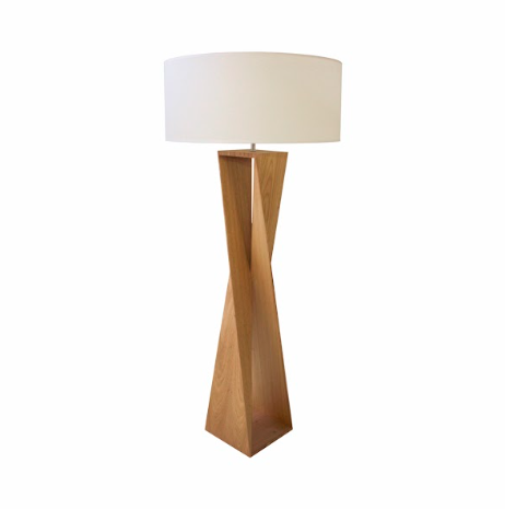 Luminária de piso feita com lâmina natural de madeira e cúpula em tecido algodão cru.