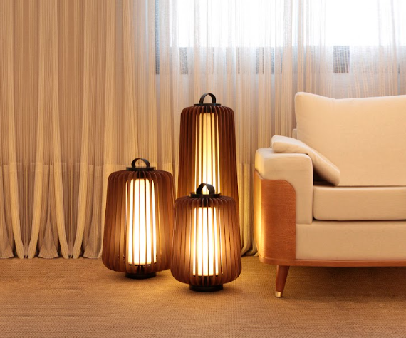 Luminária de piso feita com lâmina natural de madeira e cúpula em tecido algodão cru.