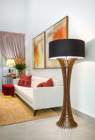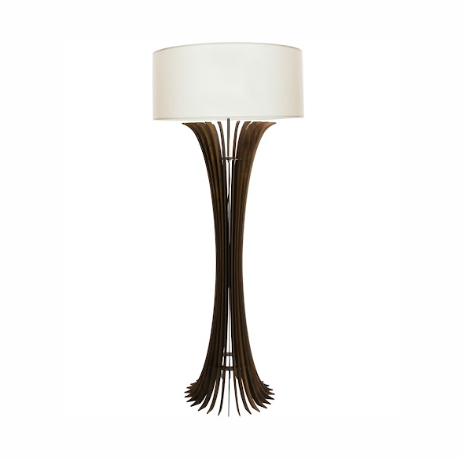 Luminária de piso feita com lâmina natural de madeira e cúpula em tecido algodão cru.