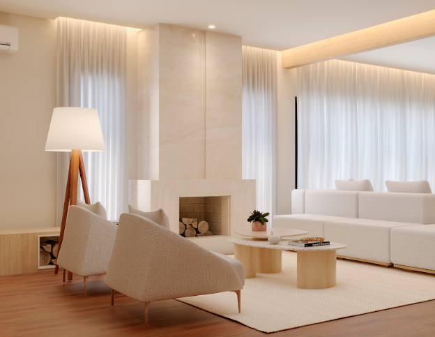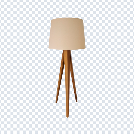 Luminária de piso feita com lâmina natural de madeira e cúpula em tecido algodão cru.